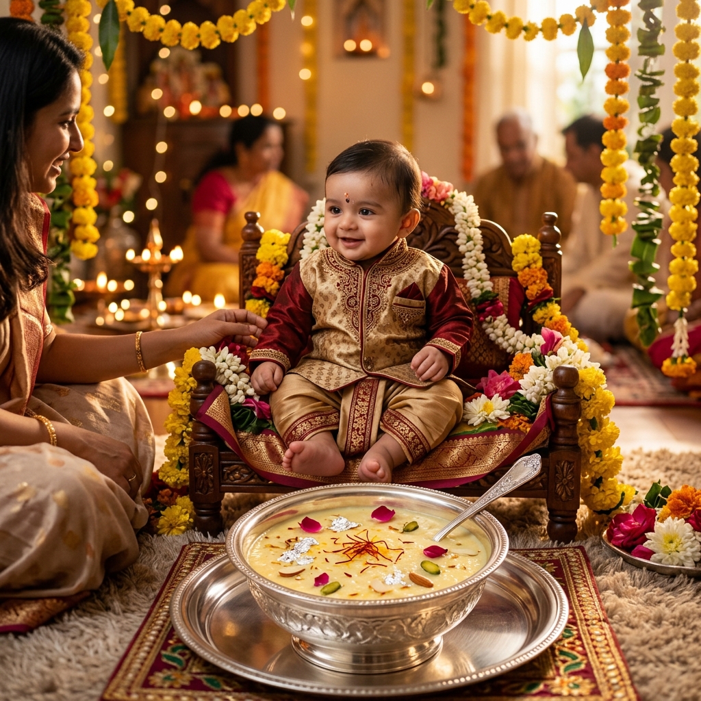 अन्नप्राशन संस्कार वह क्षण है जब शिशु पहली बार ठोस भोजन ग्रहण करता है। आश्वलायन गृह्यसूत्र के अनुसार यह षोडश संस्कारों में सम्मिलित है, और धर्मसिन्धु में लड़कों के लिए सम-मास (6वें, 8वें) और लड़कियों के लिए विषम-मास (5वें, 7वें) में अन्नप्राशन का विधान स्पष्ट रूप से उल्लिखित है। माना जाता है कि इस दिन का पंचांग-शुद्ध होना शिशु के पाचन स्वास्थ्य और दीर्घायु को प्रभावित करता है।